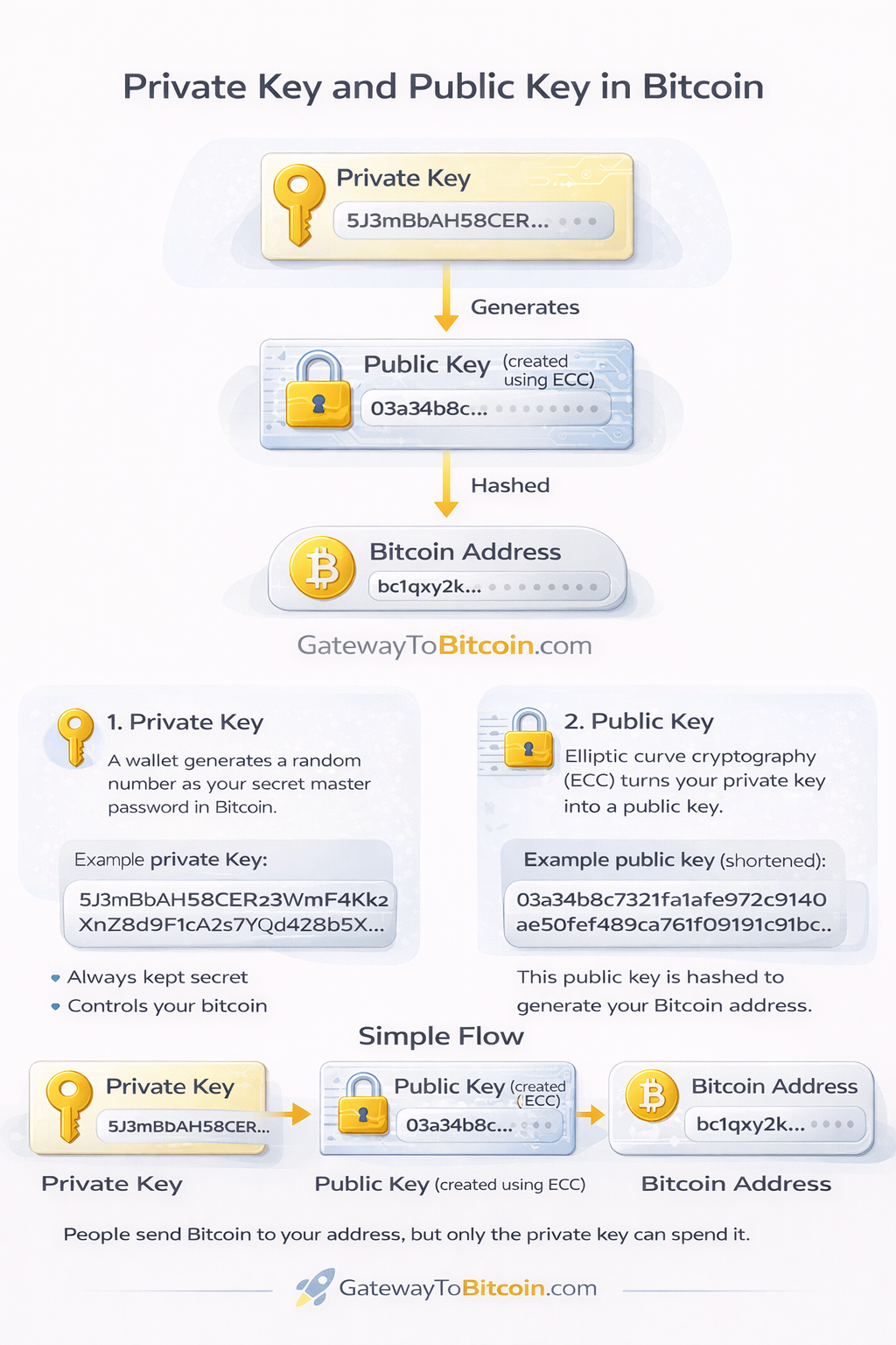 Private Key → Public Key → Hashed → Bitcoin Address