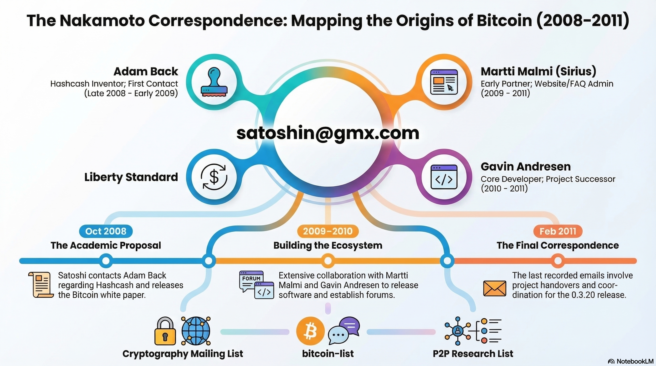 Satoshi's public correspondence spans from October 2008 to April 2011, covering the whitepaper announcement, Bitcoin v0.1 launch, iterative software improvements through versions 0.2 and 0.3, community building, and eventually the quiet handover of the project before disappearing entirely.